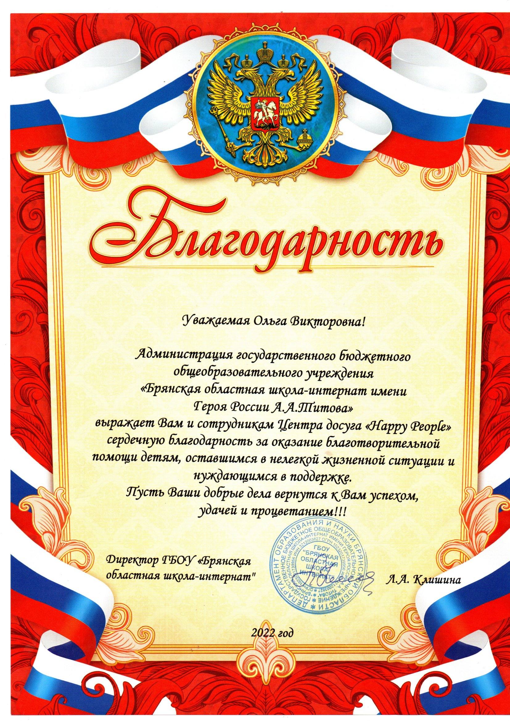 Благодарность выдана Директором ГБОУ "Брянская областная школа-интернат" Клишиной Л.А.