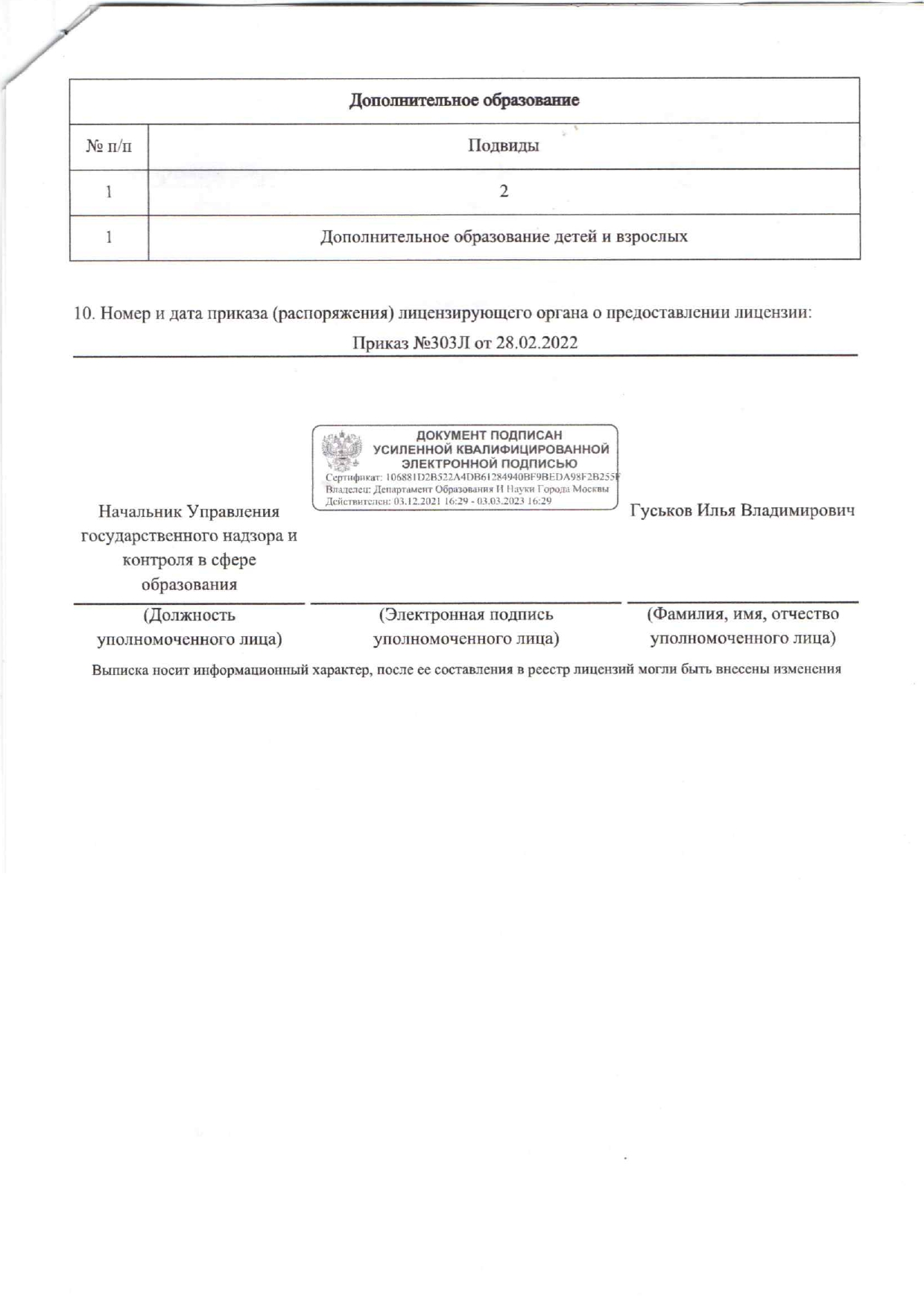 Выписка из реестра лицензий по состоянию на 02 марта 2022 года. Регистрационный номер 042029
